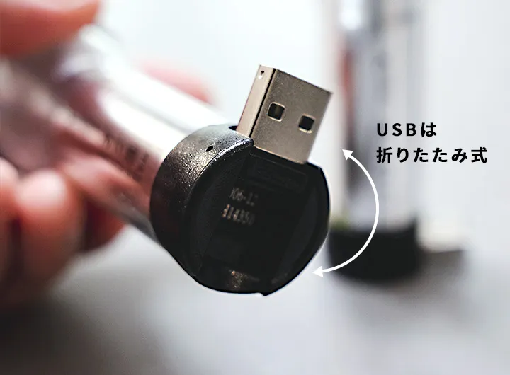 USBコネクタは本体一体型の折りたたみ式なので、USBケーブルは不要です。余計なケーブルがいらない、シンプルな設計は秀逸です。