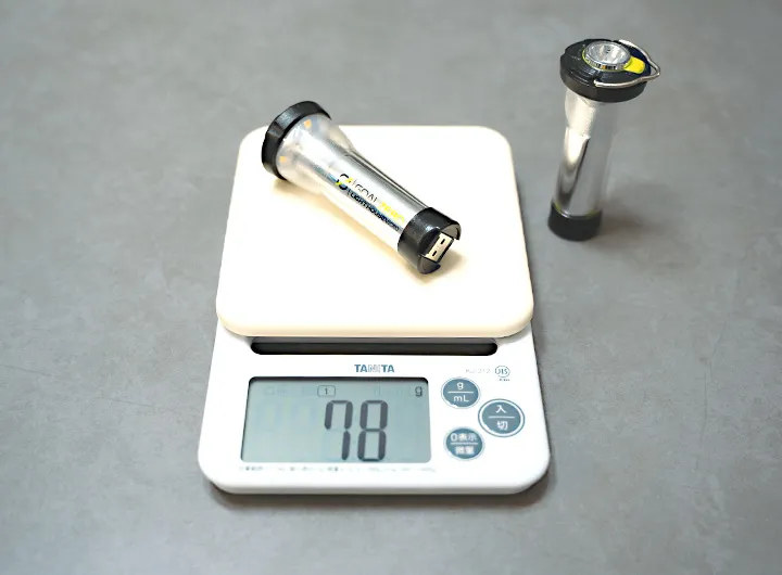 とにかく小型で軽量で携帯性が良いです。100円ライターくらいの大きさで、iQOSよりも小さく軽いです。超コンパクトでもランタンらしく、ハンギングも出来るフック付きなのが嬉しい。置き型もハンギングもどちらも楽しめます。重さは表記上は0.16ポンド(約72g)ですが実際に測ってみたら78gでした。