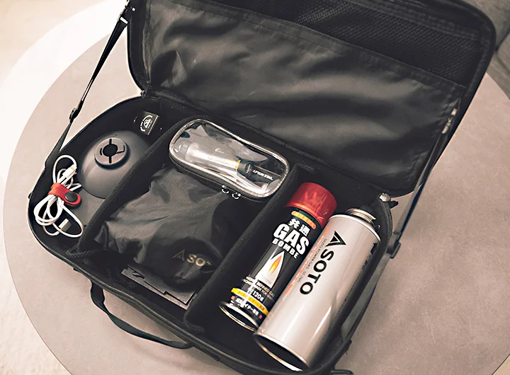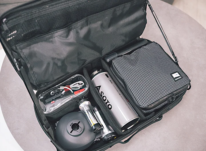 収納例としてORGANIZER CASE LARGEの高さは7.5cmなので、CD缶やRamen Pan Plusの収納にもちょうどいいです。筆者はST-340やゼログラムのラーメンパン、CD缶、まな板、モバイルバッテリー、ゴールゼロ(GoalZero)など、テーブル上で使う調理器具と電気・照明関連のキャンプギアをまとめて収納しています。ORGANIZER CASE LARGEを広げれば、食卓テーブルの準備が完了する利用法です。