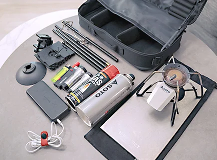 照明などの電気関連、レギュレーターストーブやライターなどガス関連をまとめた収納