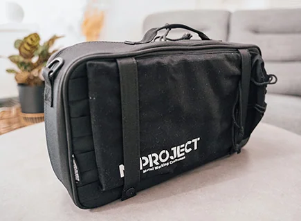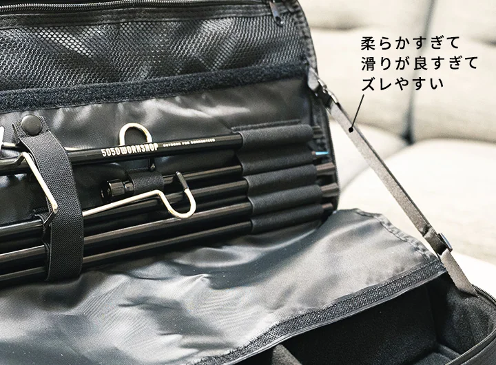 ORGANIZER CASE LARGEにはショルダーベルトが付属しています。ブリーフケースとしてもショルダーバッグとしても使える2way仕様です。収納するキャンプギアの重量に合わせて使い分けましょう。ただ、「一応ショルダー使いもできるようにしました」的な簡易的なショルダーベルトの印象です。作り込みが甘いというか。これだったらショルダーベルトは付属させないで、ブリーフケースの持ち手部分をもっと丈夫そうな生地や仕様にするとか、手が痛くならないようにクッション付きの持ち手ハンドルにするとか、どちらか一方にコストをかけた方が良いのではないかと感じました。