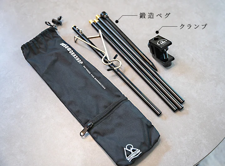 | 同梱物 | ・ダブルハンガー ・ジョイント(3本) ・クランプ(テーブルに挟み込む固定部品) ・ペグ(地面に固定する場合はペグを利用) ・収納バッグ |
