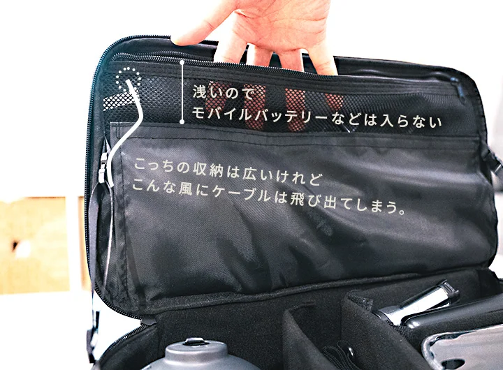 2つめ。ケースの表面には、モバイルバッテリーやiPhoneのケーブルを通せる通し穴がついてます。ただ、通し穴の裏面のメッシュポケットはとても浅く5cm程度しかないので、モバイルバッテリーやスマホは入りません。実際の収納はその下のポケットを利用することになりそう。そうすると余分なケーブルがケース内で飛び出ることになるのでスマートじゃないですよね…。