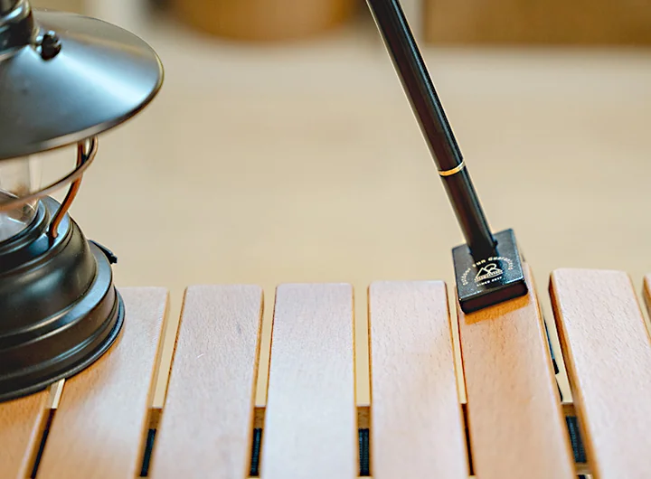 天板がロール式のテーブルにクランプで重たいランタンを吊るすと、テーブルのロール部が重量に耐えきれず傾いてしまいます。クランプは板二つ分またいで挟んだ方がいいかも。ロール式テーブルでクランプを利用する際はランタンの重量に注意しましょう。