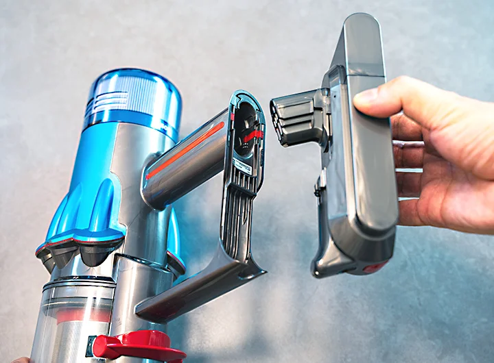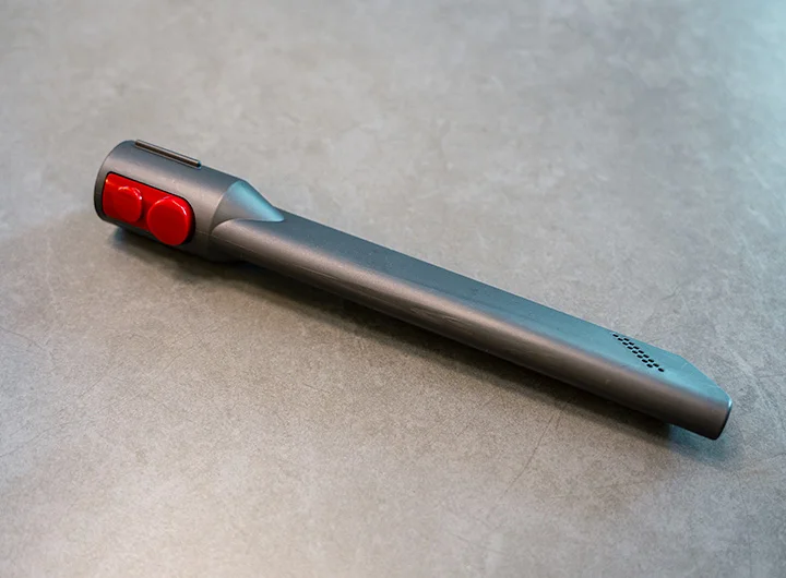 ダイソンのコードレス掃除機は各パーツの接続箇所に赤いボタンやトリガーが付いています。実物を手にしたら分かりますが、直感的に取り扱えるように設計されています。ダイソン製品はデザインが派手だけど、ユーザービリティーを考慮したデザインにもなっているんですね。ツールの付け替えやお手入れの際は、赤いボタン箇所が取り外し可能部位と覚えておきましょう。