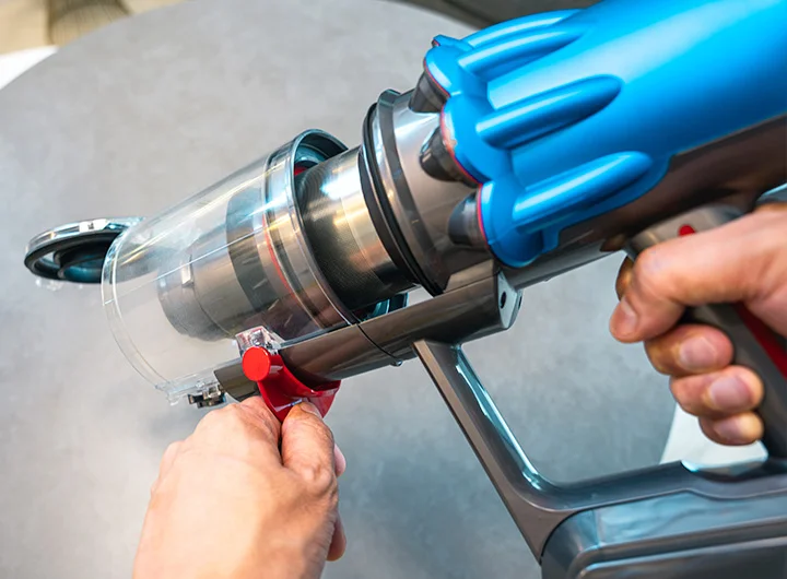 ダイソンのコードレス掃除機は各パーツを簡単に分解できて、お手入れも楽ちんです。クリアビンは定期的に水拭きか水洗いしましょう。