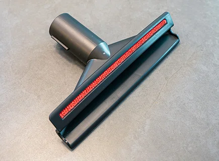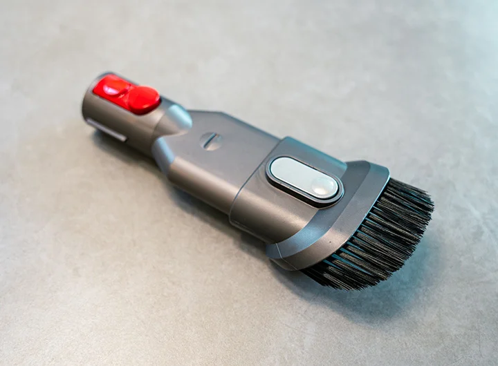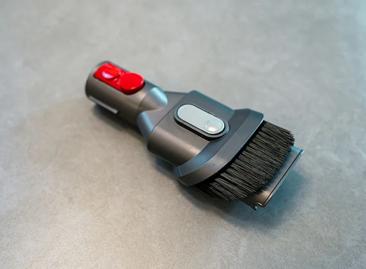 コンパクトな吸い込み口のノズルです。ブラシの出し入れが出来て、用途の使い分けができます。ブラシは細かく柔らかめ。コンパクトなサイズ感が狭いスペースの掃除に使えて便利そうなのですが、筆者はあまり使ってないです。家具棚とかの掃除に向いているのかな〜?
