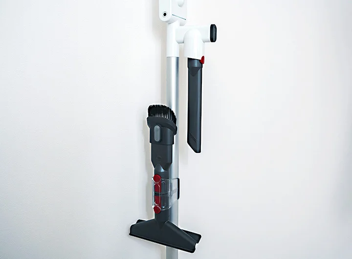 スタンドのパイプには充電ケーブルを通す溝があるため、配線のゴチャつきはなくスマートに掃除機を収納できます。他のヘッドパーツも収納できるツールクリップも付いています。筆者のスタンドは3つ分のツールクリップが付いていましたが、ダイソン掃除機はパーツが多いので3つ分じゃ足りませんでした。収納面は他社製のスタンドの方が優秀な気がするので、買い替え検討中です。