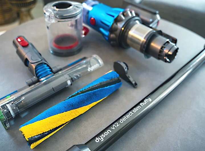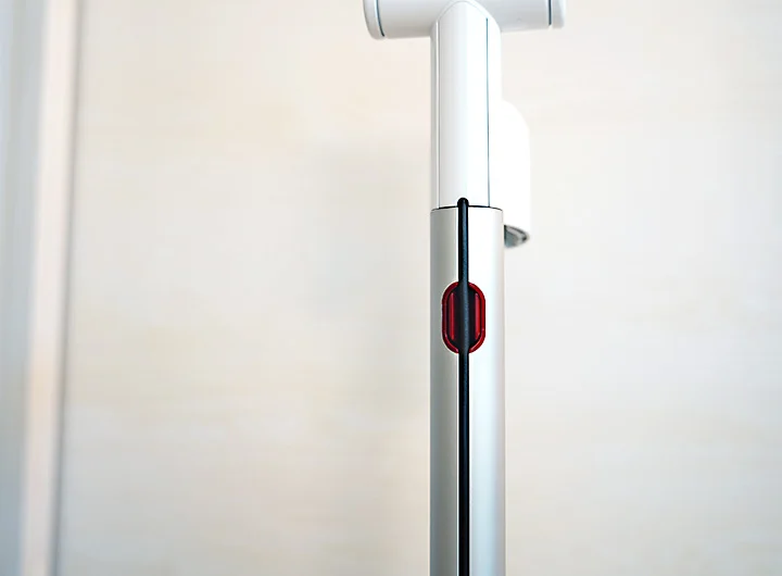 Dyson V12のサイズは幅250mm × 高さ1095mm × 奥行き234mm。前モデルより軽量化されてはいるものの、Laser Slim Fluffy クリーナーヘッド装着時の重量は2.2kgなのでそこそこ重さは感じます。壁や天井を掃除する場合、女性が片手で持ち上げるには少々きついかも。ヘッド部をフトンツールや毛絡み防止スクリューを本体に直付けした場合は、片手操作でも苦ではありません。