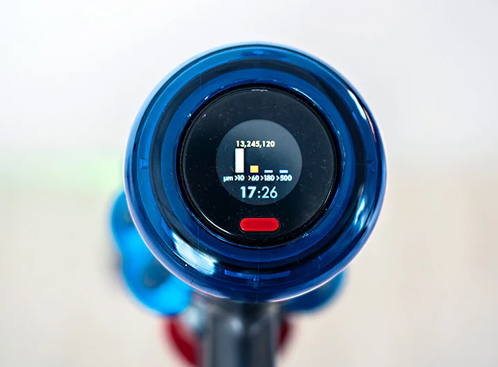 これも面白い機能で、吸引したゴミの量や種類を液晶ディスプレイで表示してくれます。肉眼で見えない花粉サイズから、目に見えるゴミまで計測して数値化します。