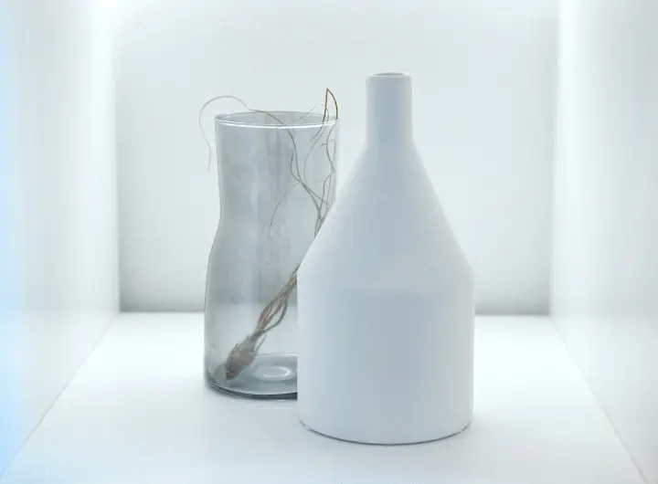 シンプルな白系、透明系のフラワーベースであれば大体の部屋に合うので無難です。筆者はKINTO(キントー)のフラワーベースを買うことが多いです。無彩色系でも造形がおしゃれなデザインを取り扱っていて、機能面もしっかりしているのでおすすめです。