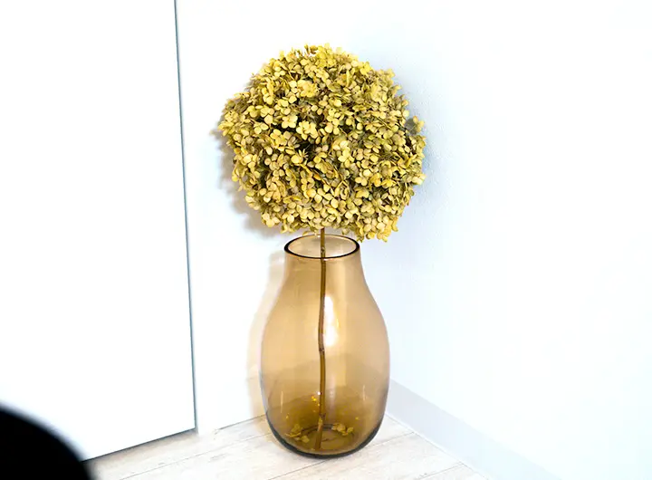このように部屋全体の配色バランスを考えて、ドライフラワーとフラワーベース、花瓶を選びましょう。一番無難な案としては、透明なガラスや白い花瓶など無彩色系のフラワーベースであれば、色数の多い部屋にも馴染みやすいです。部屋の配色バランスに困ったときは、白や黒、ガラスなど無彩色のフラワーベースや小物を選ぶようにしましょう。