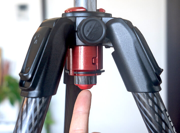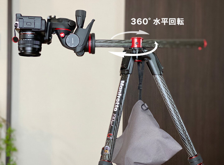 俯瞰撮影とは被写体を見おろした角度(要は真上など)から撮影することです。190go!の場合、センターポールを一番上まで引き上げて、お尻の赤いボタンを押すとセンターポールが三脚の天井を突き抜けて、水平に倒すことが出来ます。センターポールは360°の水平回転が可能です。