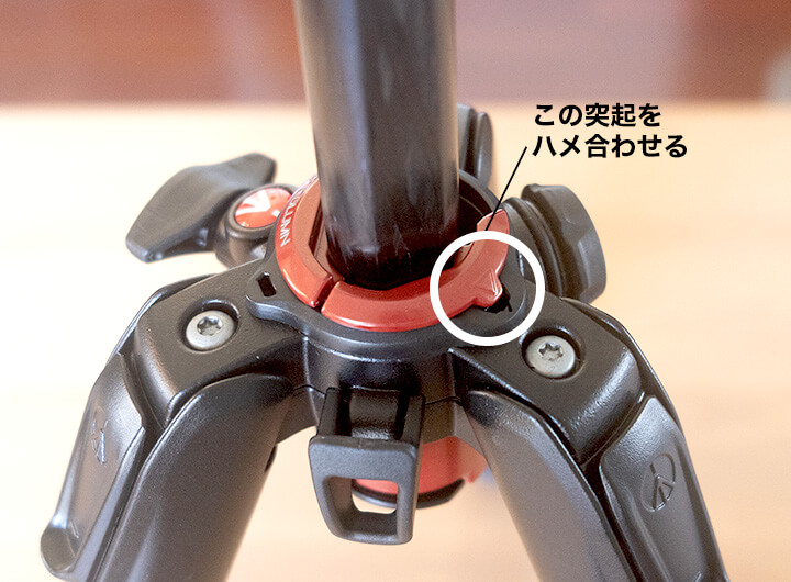 センターポールを元の位置に戻すには、下の写真の赤いパーツの突起と、三脚天井部のヘコんでいる箇所をハメ合わせることで収納出来ます。私は当初、ハメ合わせて収納することに気づかず、センターポールをガシャガシャと無理やり収納しようとしてました。危うく壊してしまうところでした…。