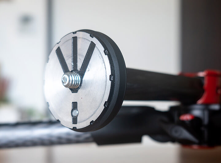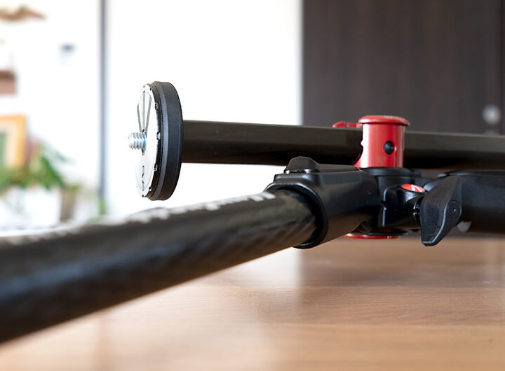 雲台を取り付けるアタッチメント部のネジは3/8オスネジです。アタッチメントの土台も広くネジも太いので、カメラや雲台をしっかり支えてくれる頼もしさがあります。