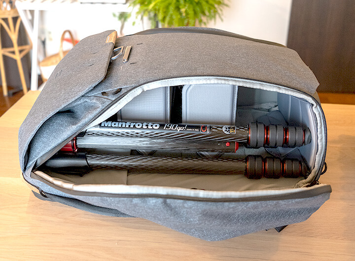 格納高は45cmで、重量は1.35kg、最大耐荷重は7kgです。持ち運ぶことも想定されたコンパクト且つ軽量な設計は、屋外撮影時に貢献します。ピークデザインのエブリデイバックパック30Lにもバッグの形を崩さずに収納出来ました。持ち運びに関しては190go!の軽量設計には助かっています。