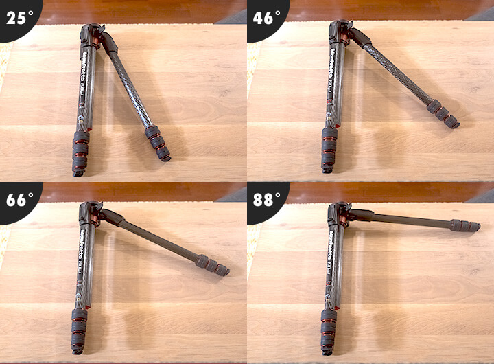 最低高は8cmです。使用する雲台にもよりますが、地面スレスレで撮影も出来ます。個人的にはこのサイズの三脚でローアングル撮影するのはセッティングに手間が掛かるので、別途ミニ三脚を使うか、カメラを地面に直置きした方が楽チンかなと思ってます。プロカメラマンではないので、大きな三脚を使わなければならないローアングル撮影の機会はほぼないからです。とはいえ、ここまで開脚出来るのは機能として備わっていて憂なしです。