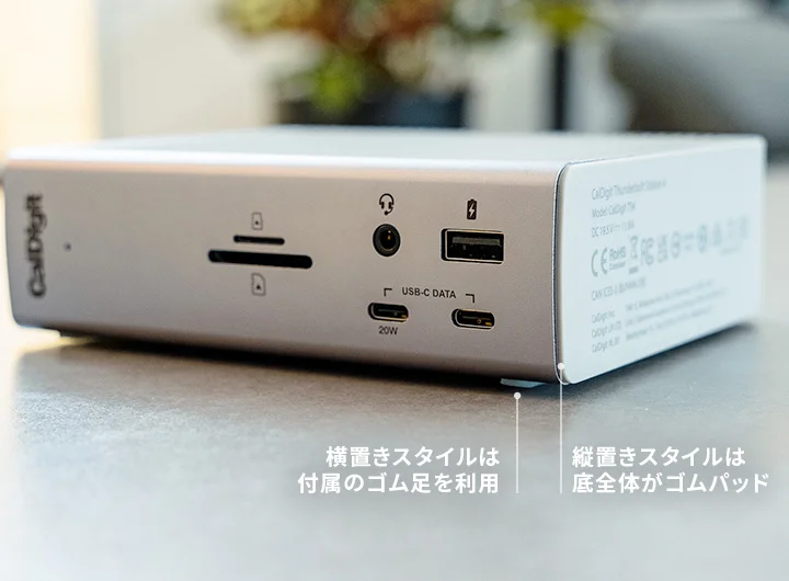 ポート数は驚異の18ポート!Thunderbolt4に対応し、DisplayPortやLANポート、USBーCやA、SDカードなど、あらゆるPC周辺機器との接続が可能。但し、HDMIポートは非搭載。ホストマシンとの接続ポートは本体背面に搭載。背面接続とポート数の多さがCalDigit TS4の特徴。縦置き/横置き両対応です。