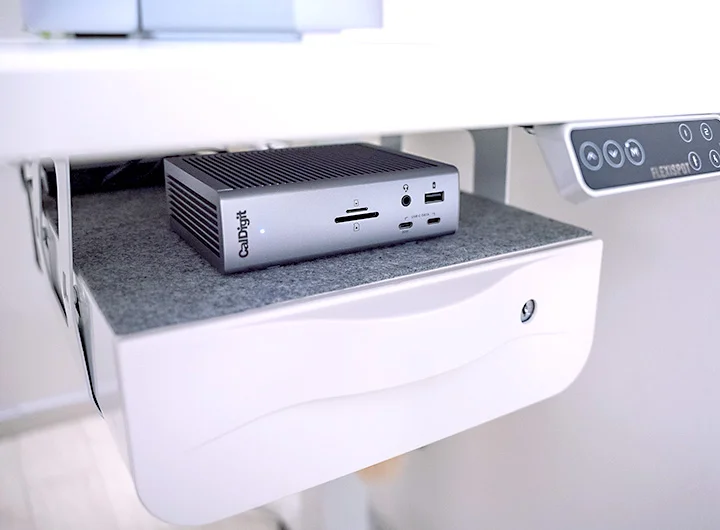 筆者は机下キャビネットに設置しました。引き出しを開ける感覚でUSBやSDカードの抜き差しができるので、おあつらえ向きの場所です。