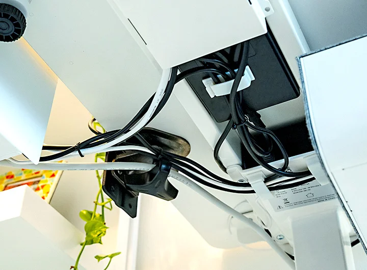 パソコン接続が背面ポートなら集約したケーブルをデスク裏の死角に隠しやすいです。結束バンドでケーブルを束ねれば、デスク裏の配線も整理しやすいです。