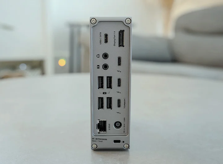 12ポート搭載。Thunderbolt4の高速データ転送。本体デザインが優れていて高級感を漂わせます。本体前面に電源ボタンがあり、エコと利便性を両立。ホストマシン接続ポートは前面搭載。デザインが良いからどんなデスク環境にもスッと馴染みますが、縦置きはできず横置き専用