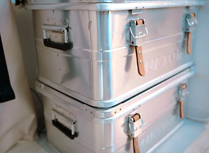 布製・樹脂製の収納ボックスだと、傷や汚れは致命的なダメージになる場合もあるけれど、アルミコンテナはラフに使える気楽さもメリット。