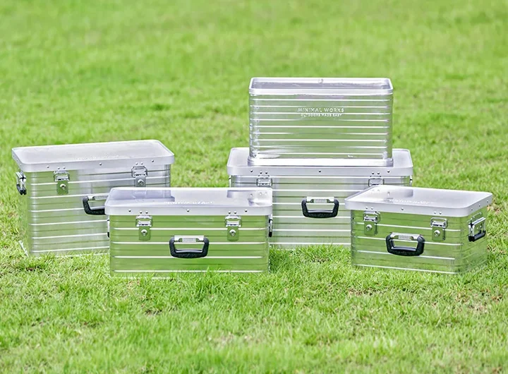 アルミコンテナは布製や樹脂製コンテナと比べ、火や水、衝撃にも強く頑丈。多少雑に扱うくらいでちょうどいい。傷や汚れも時間と共に味わいに変わっていく経年変化を楽しめるのも金属素材ならでは。